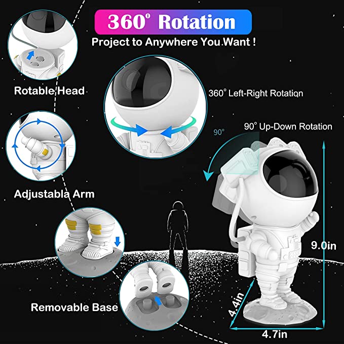 Controlling the projection of the Galaxy Astronaut Projector is a breeze. You have two options to choose from: the remote control or the buttons at the back of the device. Both options are easy to use and allow you to customize your cosmic display according to your preferences. So, whether you prefer to use the remote control or the buttons on the device, you can easily adjust the projection to create the perfect starry night sky in your room.